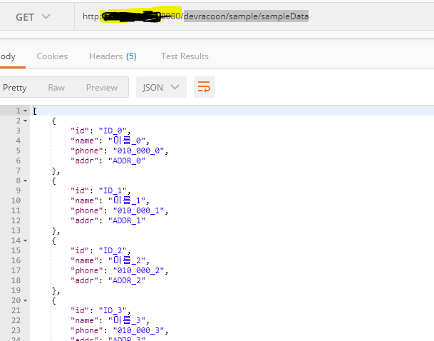 Postman을 통해 테스트 한 결과 정상적으로 가져오는것을 확인 할 수있다.