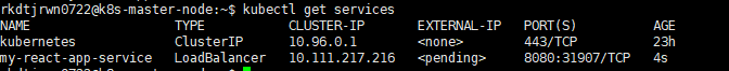 포트는 8080 port 이고 my-react-app의 내부port 도 8080 이고 이 service의 type은 LoadBalancer 라고 되어 있다.