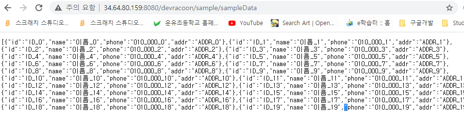 여기서 문제는 EXTERNAL_IP가 pending 이 되어 있다. exnternal_ip가 할당 되지 않아서 그런지 CLUSTER-IP로는 정상적으로 데이터가 호출이 되는데 GCE 외부IP로 호출하게 되면 접속이 안된다.