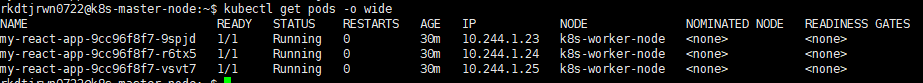 위 명령어를 실행하면 만들어 놓은 worker-node에 pod가 할당되는것을 확인 할 수 있다.
