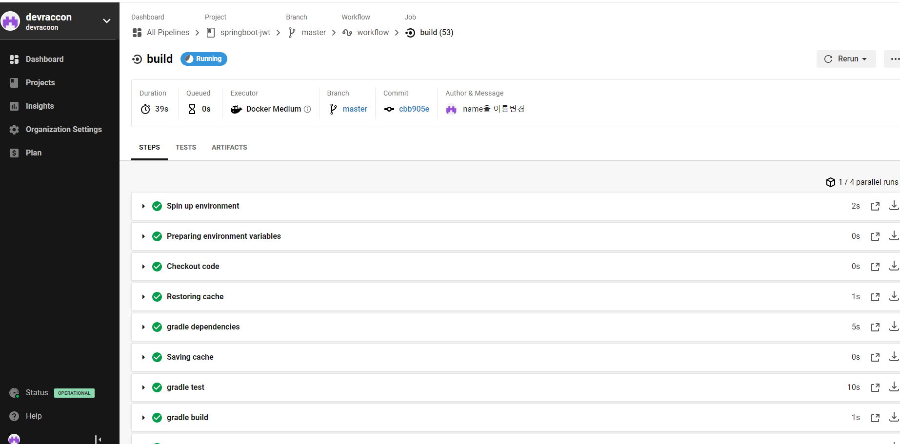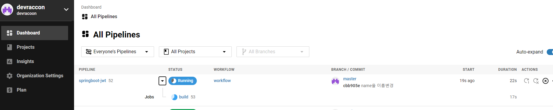 위 그림에서 보면 소스를 push하게 되면 circleci의 Dashboard 화면에서 처럼 build 가 실행되는것을 확인 할 수 있다.