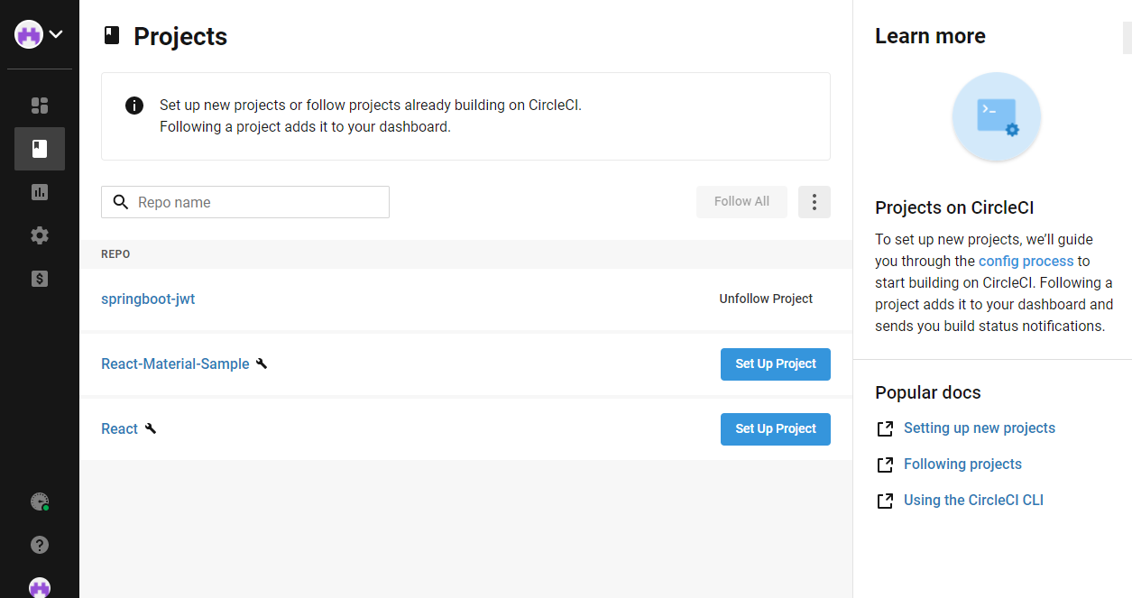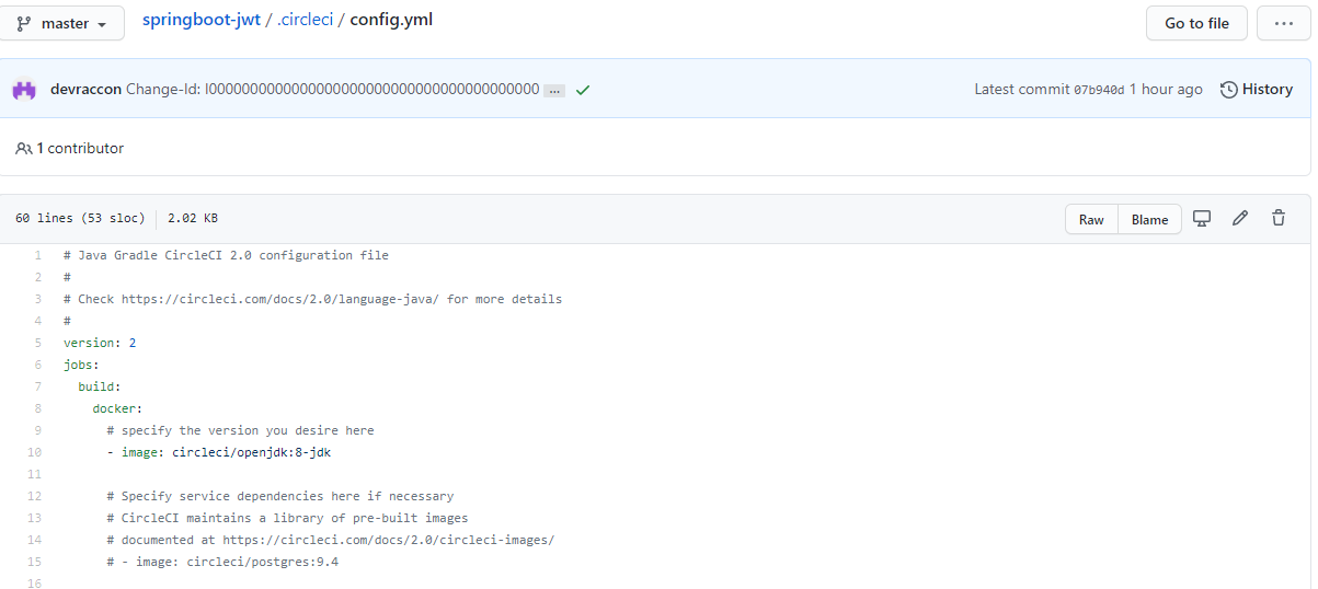 위 그림에서 springboot-jwt 는 이미 아래 그림처럼 circleci/config.yml이 추가 되어 있다.