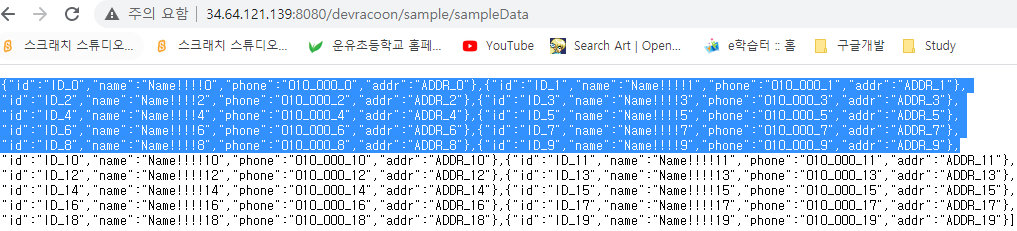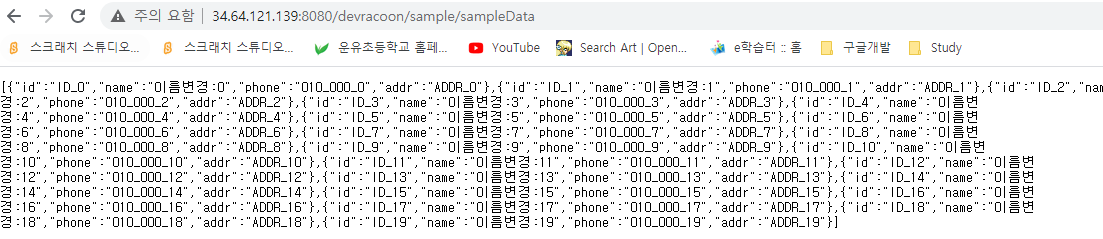 기존 API를 호출하면 아래와 같이 Name !!! 으로 데이터가 나오는것을 확인.