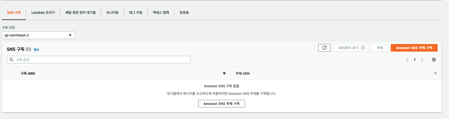 4. 생성한 SQS의 상세 화면에서 아래쪽에 보면 "SNS 주제구독 " 이라는 버튼이 보인다.