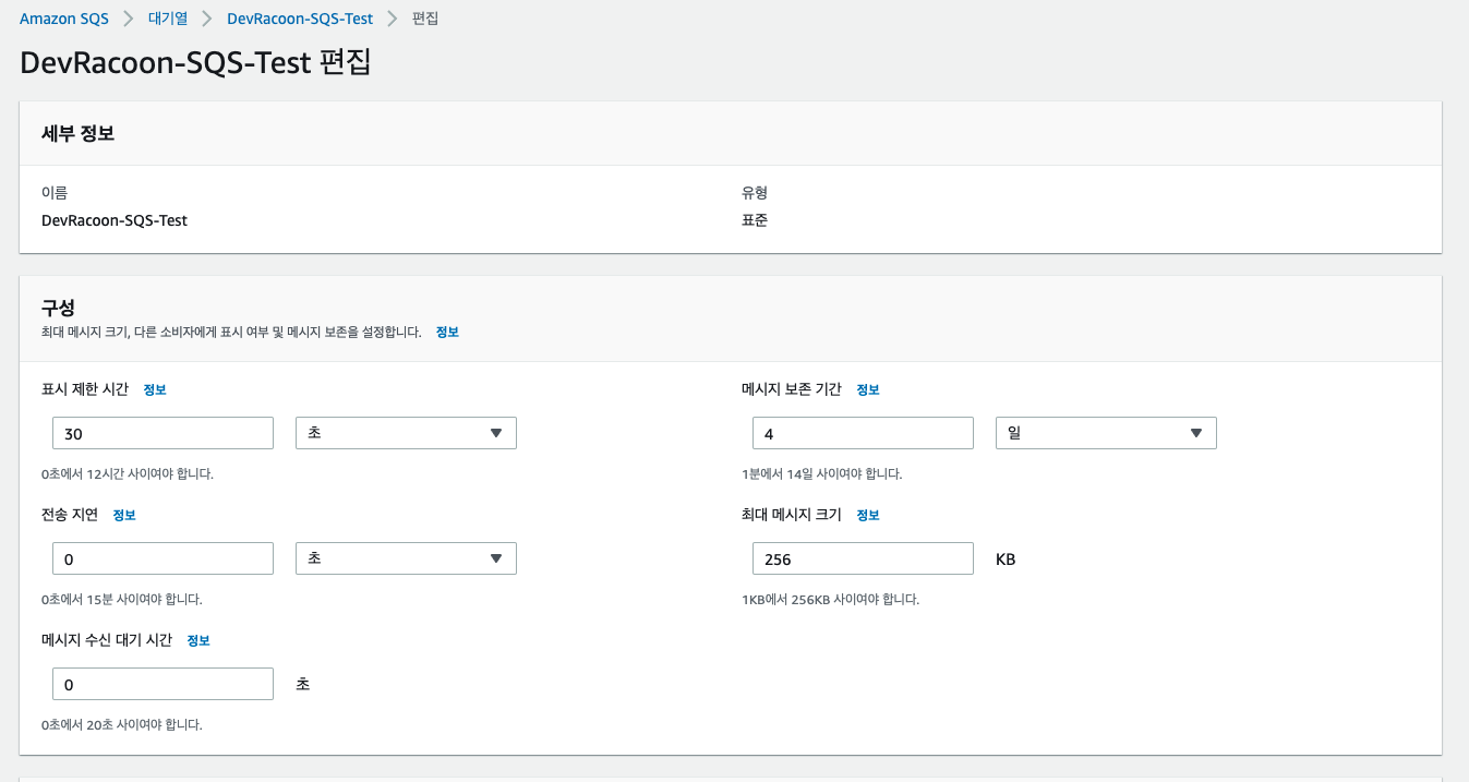 운영상의 SQS에서는 표시제한 시간이나 메세지 보존기간은 변경을 해야 한다.