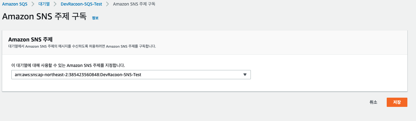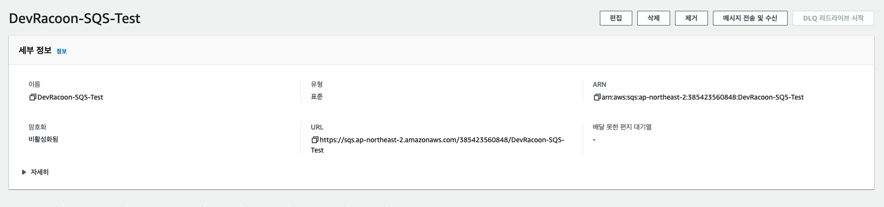 SQS 역시 기본정보로 생성을 했다. 테스트의 목적이기때문에 보존기란이나 다른 설정은 손대지 않았지만