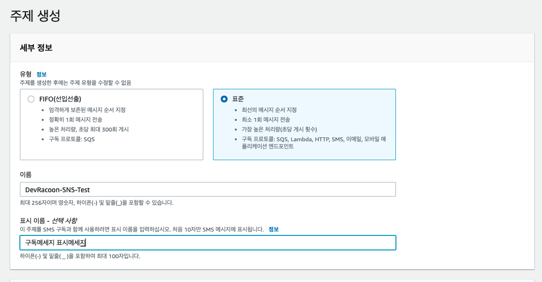 1. AWS Console로 접속 > Simple Notification Service 이동 > 주제 ( Topics ) 선택 > 주제 생성 클릭