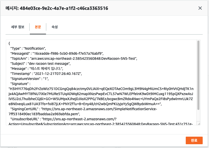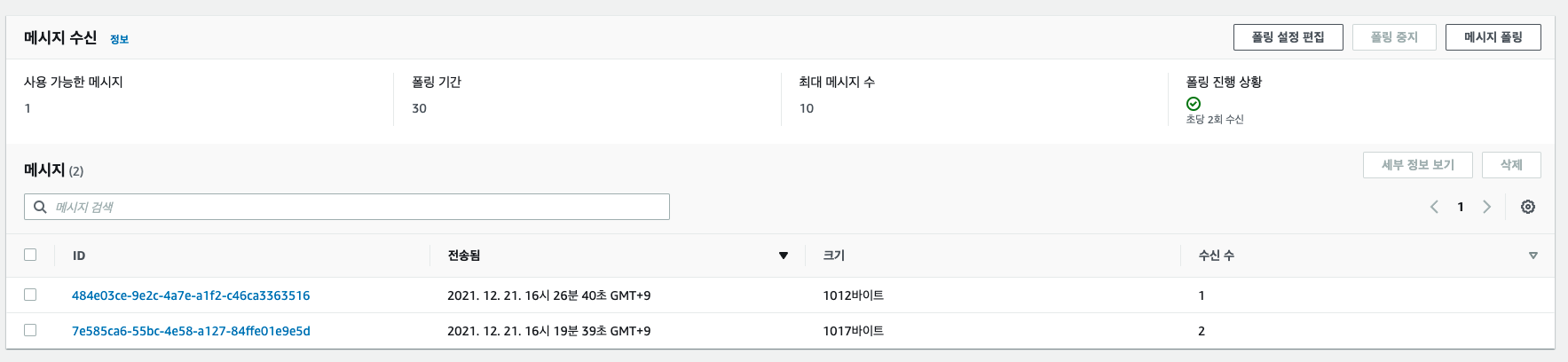메세지 폴링 버튼을 클릭하면 SNS에서 보낸 메세지가 들어오는것을 볼수 있다.