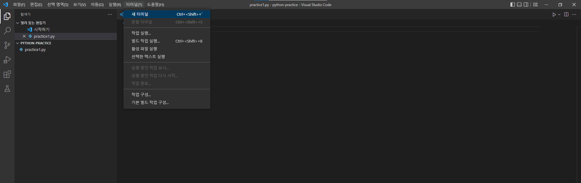 화면 상단의 터미널 메뉴에서 새 터미널을 클릭해 보세요.