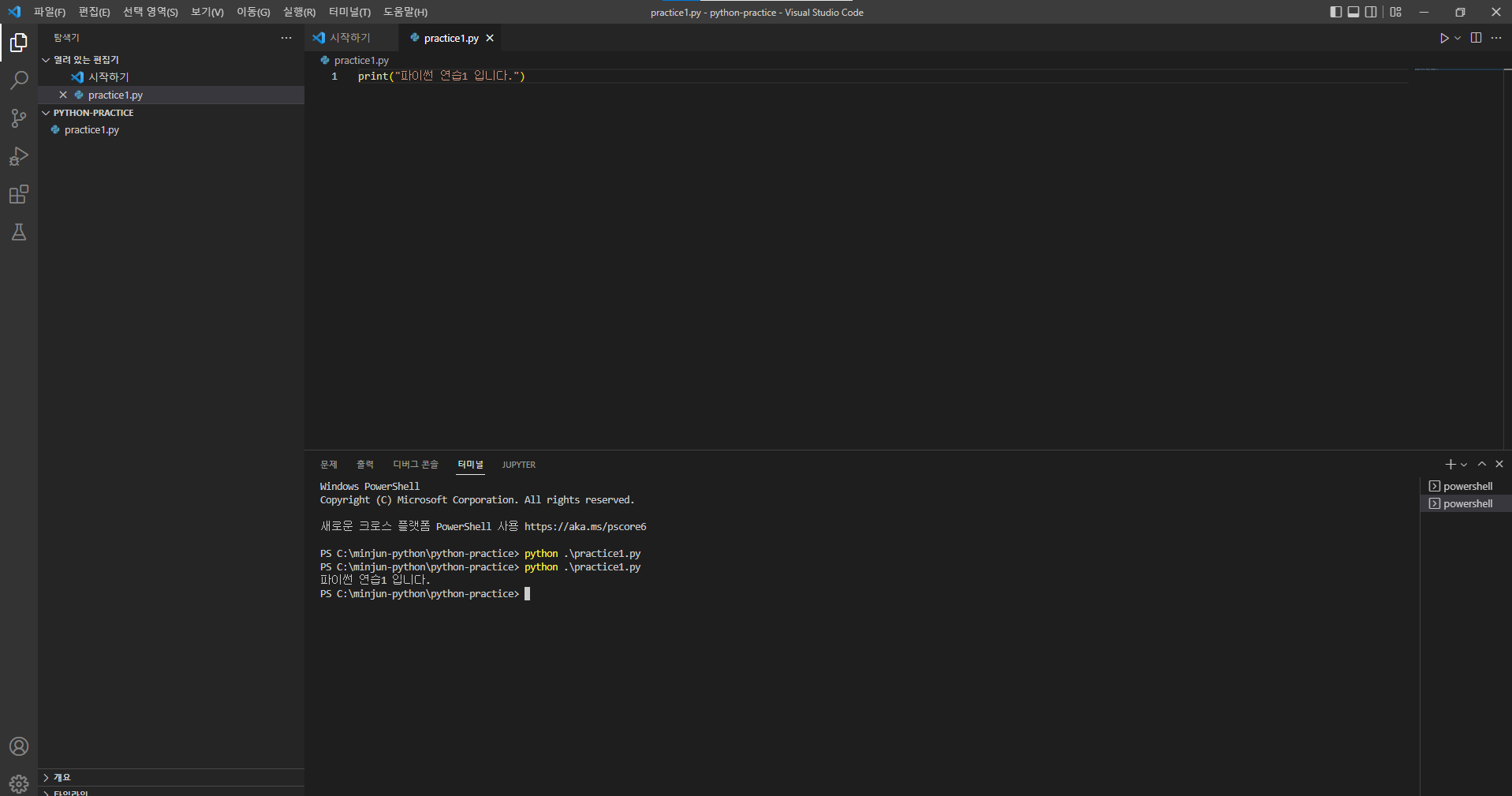 이제는 "파이썬 연습1 입니다." 라는 글자가 보이죠? 이렇게 글자가 보이면 파이썬 파일과 지금까지 환경 설정이 잘 되었다는 뜻입니다.