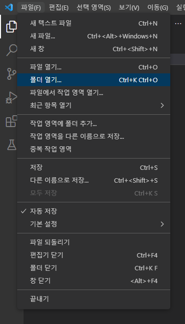 왼쪽 상단의 파일 부분을 클릭하고 폴더열기를 선택해서 원하는 디렉토리( 폴더 ) 로 이동해서 practice.py파일을 만듭니다.