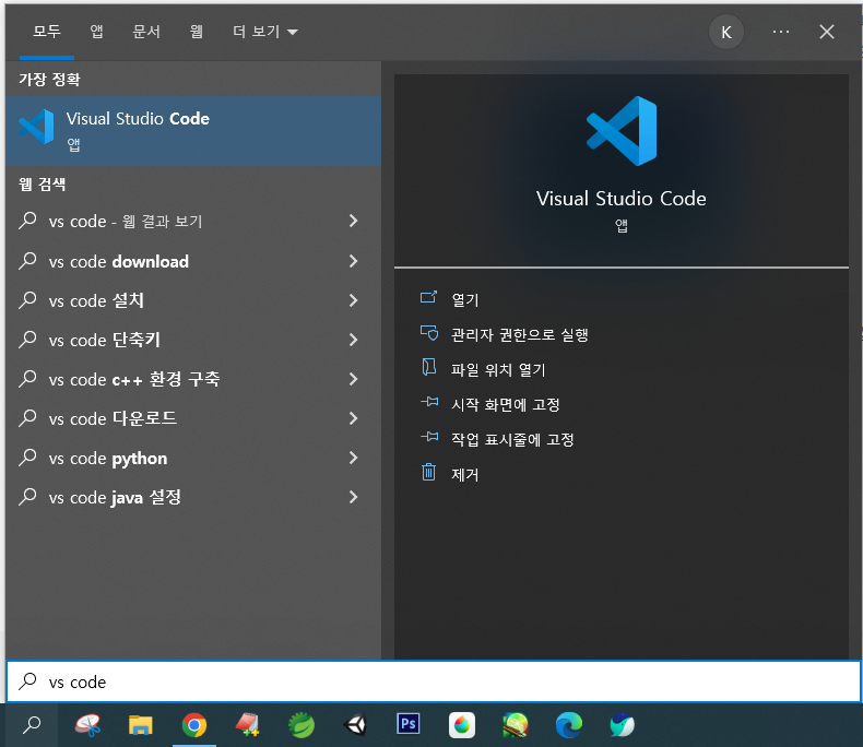 왼쪽 아래의 돋보기를 클릭하고 vs code를 입력하고 vs code 앱을 선택합니다.