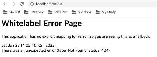 요렇게 서버 기본 에러페이지가 뜨는것을 확인.