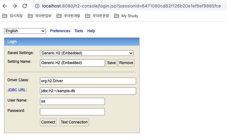 DB 연결이 잘되는지 확을 위해 브라우저 창에 아래와 같이 연결했을때 h2 console 화면이 뜨면 성공!